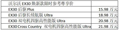 今日,豪华纯电SUV沃尔沃EX30焕新款正式上市,新车共推出四大版本,限时参考尊享价15.98万元—21.98万元*,同步推出多重限时大定权益,包括3年基础整车质保、免费三电系统8年16万公里质保、3年免费沃尔沃救援服务以及首任车主4年免费媒体数据流量权益。新车不仅以入门即豪华的硬核实力,配合诚意售价与限时权益,全面刷新豪华纯电小型SUV价值标杆,更凭借出众设计、可靠安全与高效三电实力,成为都市年轻精英、时尚家庭的高品质纯电出行优选。